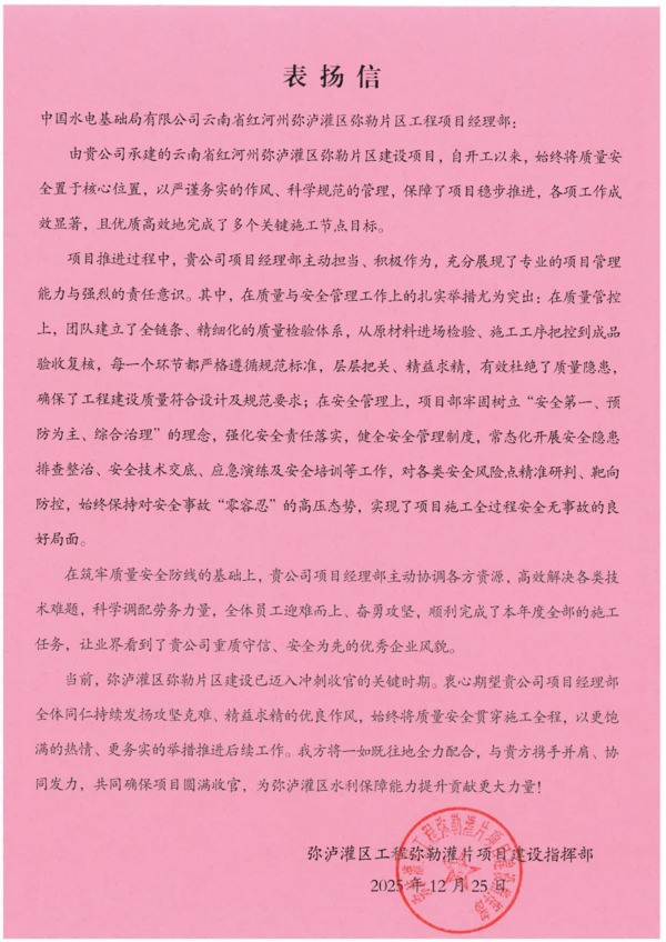12月25日,二公司承建的云南省红河州弥泸灌区弥勒片区工程项目收到项目建设指挥部表扬信,肯定项目部在2025年度施工生产中的优异表现。