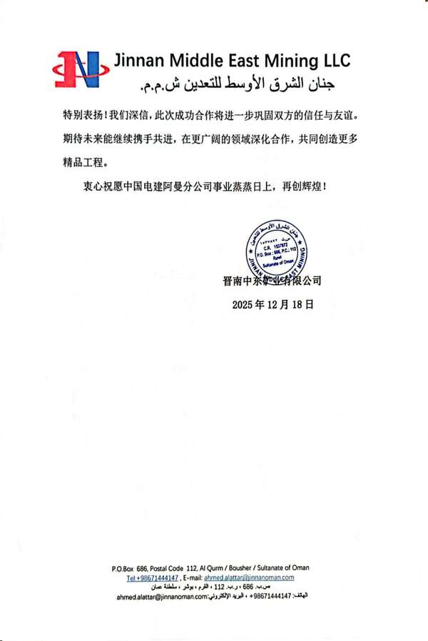 感谢信指出,面对阿曼当地复杂工程地质条件和持续高温环境挑战,公司展现出卓越专业素养与高度责任心。项目团队通过科学统筹规划、精细化管理与顽强拼搏的作风,不仅圆满完成年度施工任务,更在施工效率与工程质量上均超出预期,为选矿厂项目整体推进奠定坚实基础。