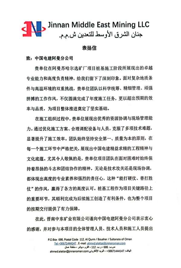 近日,阿曼苏哈尔选矿厂桩基项目收到业主单位发来的感谢信,对项目团队专业能力、负责精神与突出贡献给予高度评价和衷心感谢。