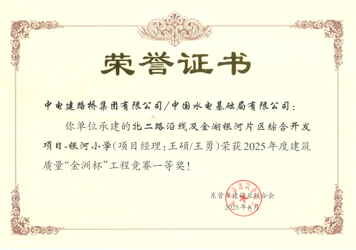 8月19日,东营市建筑业联合协会公布了《关于2025年度建筑和装饰装修质量“金洲杯”工程竞赛评选结果的通报》,由公司承建的金湖银河片区综合开发项目-银河小学工程荣获“金洲杯”一等奖。 银河小学项目位于东营经济开发区园博路以南,规划二路以西。项目总占地面积45499.87平方米,总建筑面积30496.00平方米,其中地上27516.00平方米、地下2980.00平方米。建设内容主要包括教学楼、综合楼、实验楼、报告厅、体育馆、餐厅、人防工程等。项目曾荣获山东省建筑施工安全文明标准化工地、东营市安全文明工地、东营市(BIM)技术应用项目、东营市优质结构工程等多项荣誉。项目部全体成员始终秉承水电基础局“责任 创新 诚信 共赢”的核心价值观,坚持高质量、高品质履约,以质量树品牌、以创新求发展,努力铸就行业精品。 “金洲杯”奖是东营市建设工程质量的最高荣誉奖,每年评选一次,经过层层筛选、评审、现场复查等过程,最终确定16个项目入围。所参评项目必须在开工前制定创优计划、质量目标、技术保障措施,强化质量控制要点,精心组织施工,严格检查验收,实施过程中做好整个工程技术档案资料同步归集等工作,争创“金洲杯”荣誉的过程也是项目强化全流程管理的过程,获得“金洲杯”的项目工程质量代表了东营地区同类工程领先水平。 |