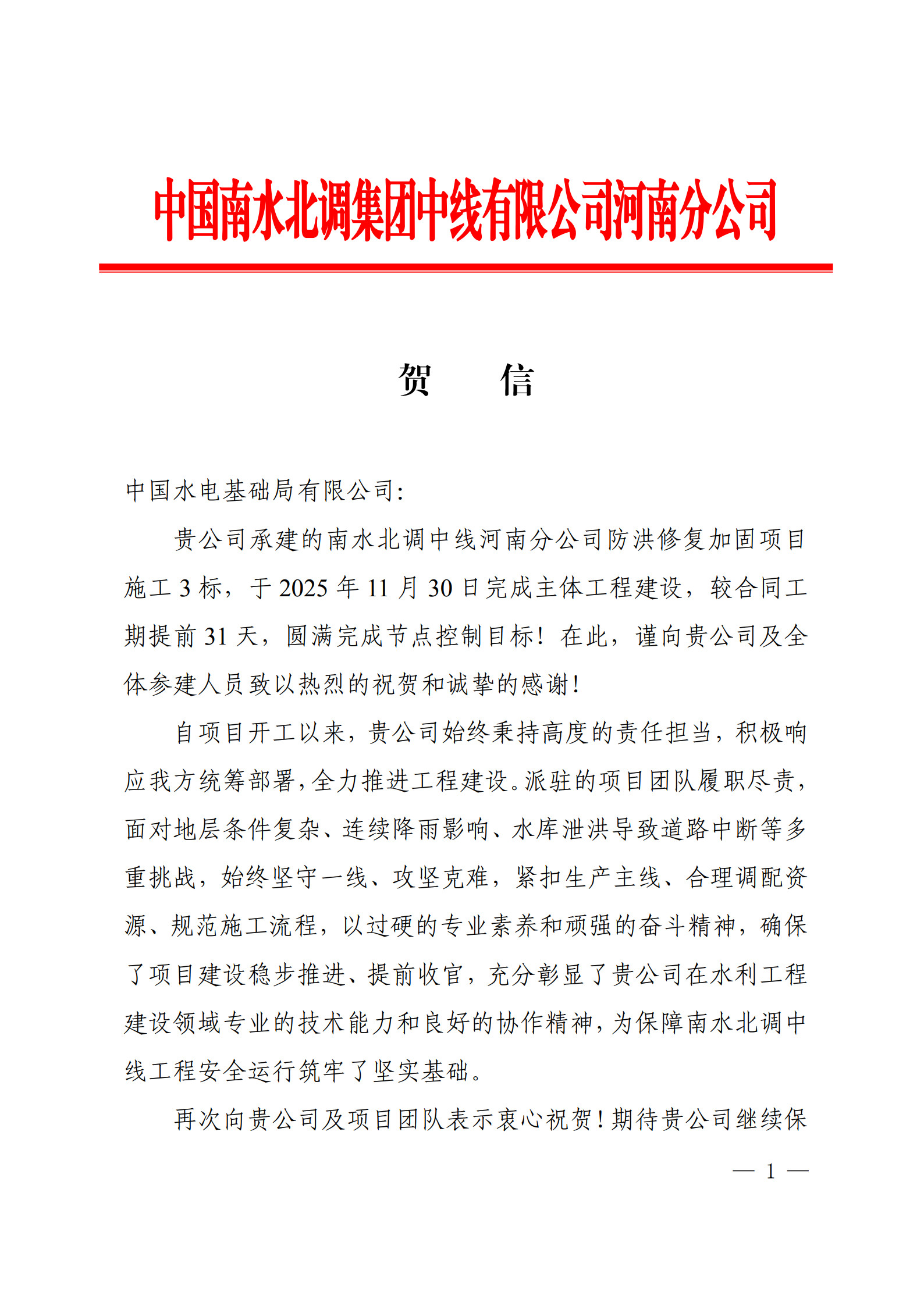 近日,二公司承建的南水北调中线防洪修复加固项目施工3标传来捷报——项目于2025 年11月30日圆满完成主体工程建设,较合同工期提前31天达成节点控制目标。12月5日,项目业主单位中国南水北调集团中线有限公司河南分公司专门发来贺信,对项目团队的优异表现致以热烈祝贺和诚挚感谢。 贺信指出,自项目开工以来,水电基础局项目部始终秉持高度责任担当,积极响应业主方统筹部署,全力推进工程建设。施工过程中,项目团队面临地层条件复杂、连续降雨影响、水库泄洪导致道路中断等多重挑战,全体参建人员始终坚守施工一线,以攻坚克难的决心紧扣生产主线,通过合理调配资源、规范施工流程,凭借过硬的专业素养和顽强的奋斗精神,确保项目建设稳步推进并提前收官。这一成果充分彰显了水电基础局在水利工程建设领域的专业技术能力和良好协作精神,为保障南水北调中线工程安全运行筑牢坚实基础。 收到表彰后,项目部全体人员备受鼓舞。大家表示,将珍惜这份荣誉,再接再厉,持续保持较高的政治站位,进一步深化现场精细化与标准化管理,严格坚守工程质量与安全底线,全力以赴高质量完成后续所有建设任务,不辜负业主单位的信任与期望,为南水北调工程建设再作贡献。 据悉,未来水电基础局还将与中国南水北调集团中线有限公司河南分公司进一步深化合作,携手共进,在工程建设领域再创辉煌。 【责编:魏瑶】 |
