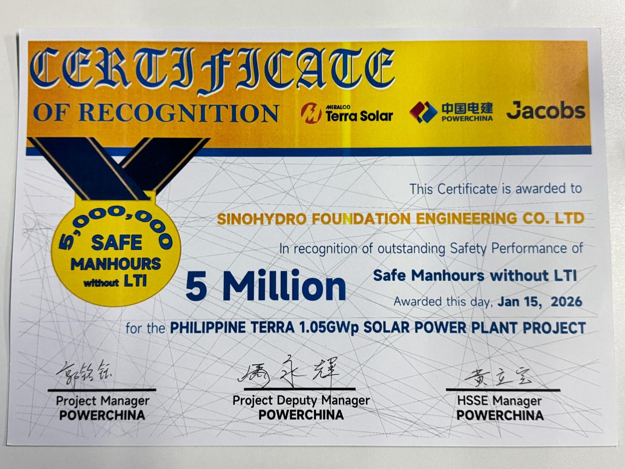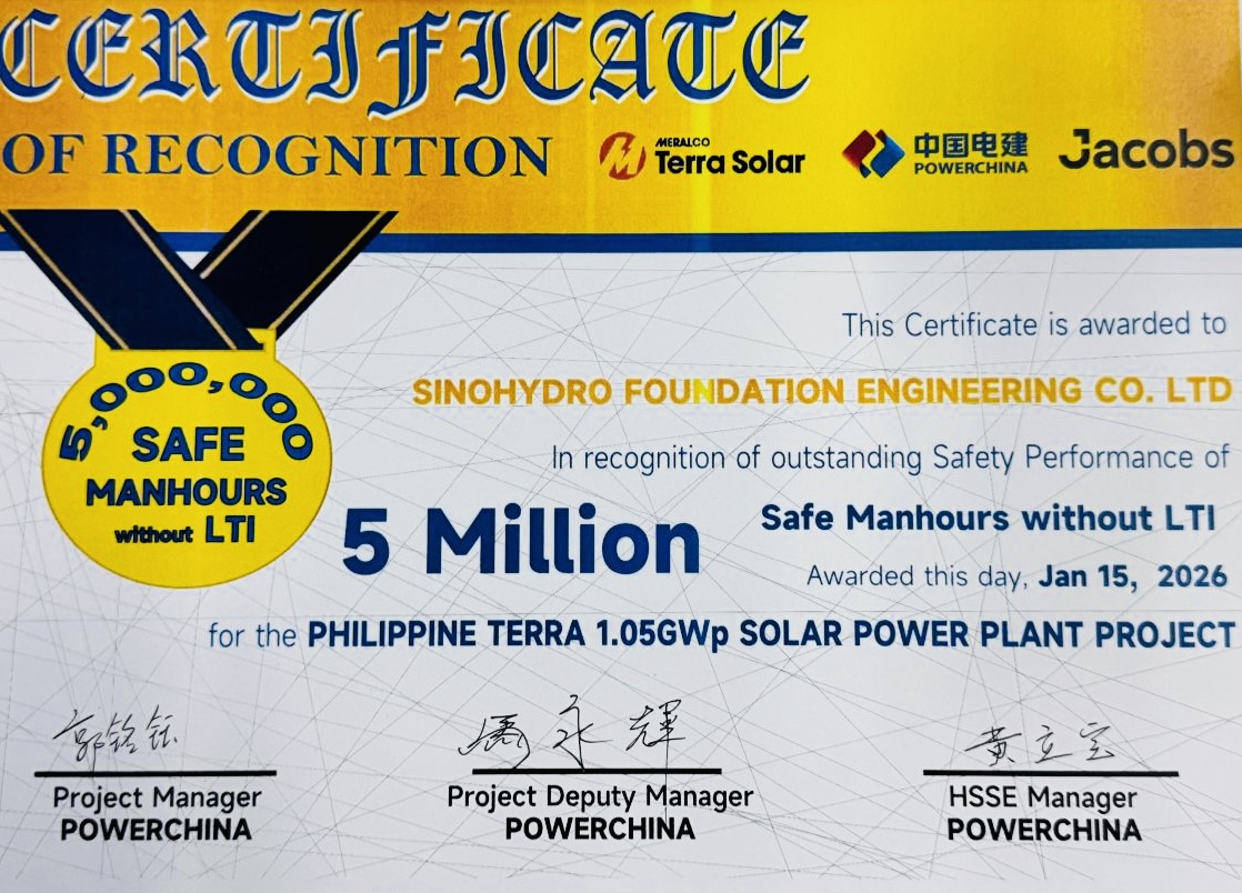 近日,菲律宾圣马塞利诺283MW光伏建设项目新增Terra区域甲方单位隆重举办500万安全工时庆典活动,对在项目建设过程中严守安全底线、助力实现安全工时目标的参建单位进行表彰。项目部凭借扎实安全管理体系、卓越团队执行力及零安全事故的优异成绩,被甲方授予“卓越团队奖”(Outstanding Safety Team Award)。 项目部始终坚持“安全第一、预防为主、综合治理”方针,将安全管理贯穿施工全过程。健全安全管理责任体系,形成“人人有责、层层落实”的安全管理网络,定期组织开展新员工入场培训、特种作业人员专项培训、安全技术交底等活动。实行日常巡查、专项检查、综合督查相结合的排查机制,全年共排查整改安全隐患34项,整改完成率100%;同时编制火灾、坍塌、高处坠落等各类应急预案14项,组织应急演练3次,提升了应对突发安全事件的处置能力。 项目位于三描礼士省菲律宾吕宋岛,是当地改善环境领域的重要项目,占地面积500余公顷,总装机容量为584兆瓦。作为公司在菲律宾承建的第一个光伏项目,是菲律宾团队首次向新能源领域一次成功转型,承建了项目现场办公营地、场地平整、光伏场区桩基等施工。目前,项目一期和二期每年可向菲律宾供电6亿千瓦时,改善了菲律宾能源不足、资源匮乏、用电昂贵等问题。 项目负责人表示,将以此次表彰为契机,进一步巩固安全管理成果,持续优化安全管理措施,积极借鉴行业先进安全管理经验,加强与甲方及各参建单位沟通协作,共同打造安全、优质、高效精品工程,不辜负甲方信任与期望。 |