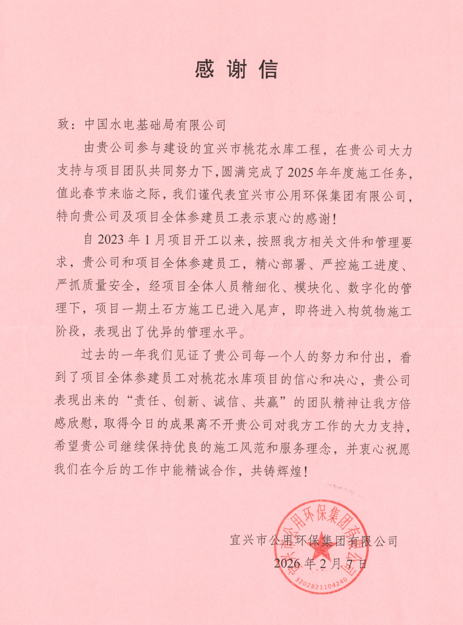 新春将至,暖意传情。近日,江苏省宜兴市桃花水库项目收到宜兴市公用环保集团有限公司感谢信,信中对公司圆满完成宜兴市桃花水库工程2025年度施工任务表示诚挚感谢。 自项目开工以来,桃花水库项目团队严格落实业主管理要求,精心组织施工,严控进度、质量与安全,通过精细化、模块化、数字化管理,顺利实现一期土石方施工收尾,即将转入构筑物施工阶段,展现了过硬的管理能力与专业水平。 信中提到,过去一年里,宜兴市公用环保集团见证了项目团队的辛勤付出与坚定决心,高度赞扬了公司秉持“责任、创新、诚信、共赢”的企业精神。 项目负责人表示,下一步,项目部将以此为动力,坚守初心、精益求精,持续推进后续工程建设,为地方水利建设贡献更大力量。 【责编:梁晶晶】 |